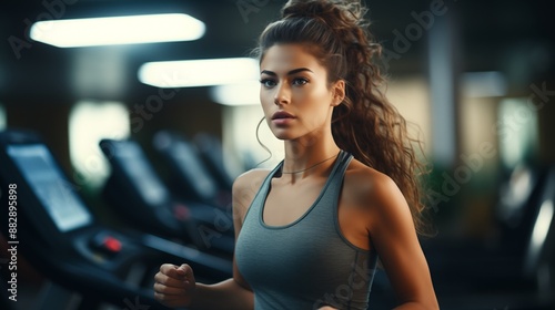 © Muzamil, Obraz premium Portrait of beautiful woman working out at gym, running on treadmill and doing fitness exercises. healthy concept