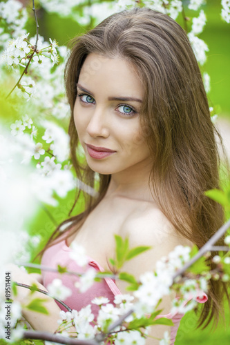 Fototapeta premium Portrait of beautiful young brunette woman in spring blossom