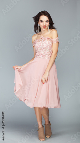 © Anastasia Rudenko, Fototapeta premium Portrait of beautiful young european brunette girl in peach pink dress on grey background, prom dress