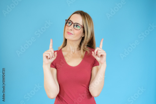 © Danko, Fototapeta premium Portrait of beautiful young woman pointing up over blue background.