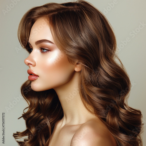 © Виктория Дутко, Obraz premium Portrait of beautiful young woman with long wavy hairstyle. Perfect makeup.