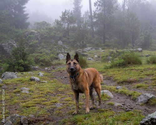 Naklejka premium portrait of Belgian Malinois shepherd purebred dog in foggy forest