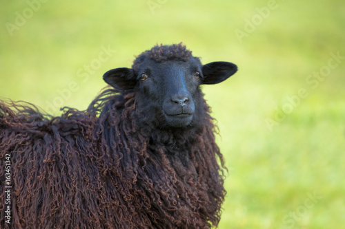 Obraz premium portrait of black sheep on green meadow on green grass background