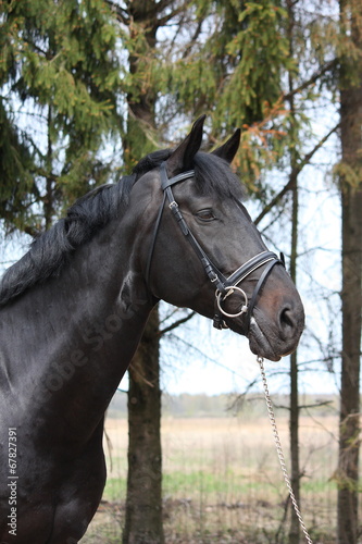 © virgonira, Naklejka premium Portrait of black sport horse with bridle