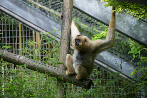 © pixarno, Naklejka premium Portrait of brown gibbon perched on branch in a zoologic park