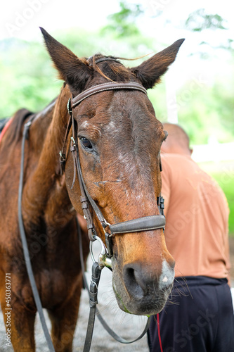 © Pijitra, Fototapeta premium portrait of brown horse and stableman