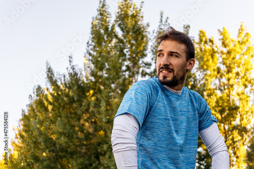 Obraz premium portrait of caucasian man in park with sportswear over a tree