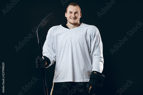 © alfa27, Naklejka premium Portrait of cheerful proud caucasian hockey player smiling with teeth, looking in camera with happy and relaxed face expression, posing after victory in hockey match with stick, isolated on white