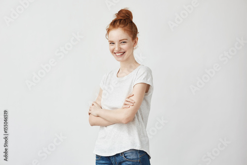 Naklejka premium Portrait of cheerful young redhead girl laughing with crossed arms.