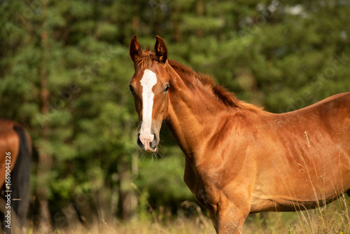 © anakondasp, Fototapeta premium portrait of chestnut sportive foal grazing at pasture at sunny summer day. close up