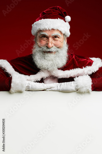 © Seventyfour, Naklejka premium Portrait of classic Santa Claus smiling gleefully at camera while posing over blank white sign, copy space