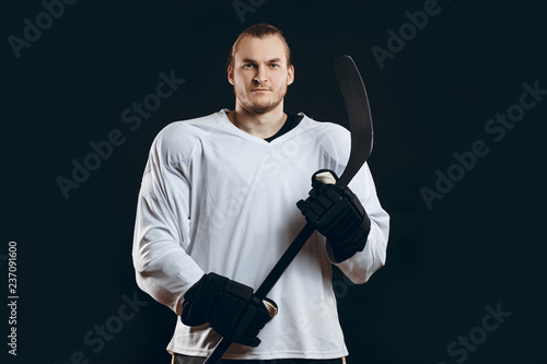 © alfa27, Fototapeta premium Portrait of confident professional hockey in white uniform player holds gaming stick isolated on black background.