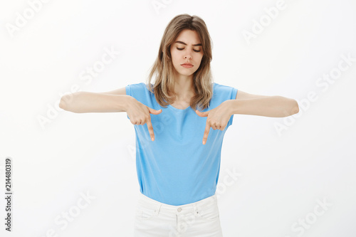 Fototapeta premium Portrait of confused intense attractive european female in blue t-shirt, pointing and looking down with suspicious unsure expression, hesitating or being unaware what she sees over gray background