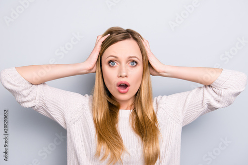 Fototapeta premium Portrait of curious frustrated girl with wide open mouth holding two hands on head looking at camera isolated on grey background