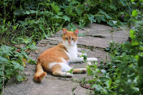 © zoranlino, Fototapeta premium Portrait of cute and sweet domestic multicolored playful cat enjoying in fun and game, resting in beautiful garden on nice day and nature environment with green vegetation. Happy cat and life of pet.