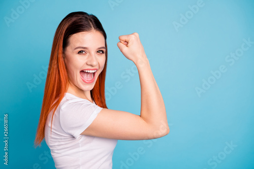 Fototapeta premium Portrait of cute attractive ecstatic lady youth raise fist open mouth...