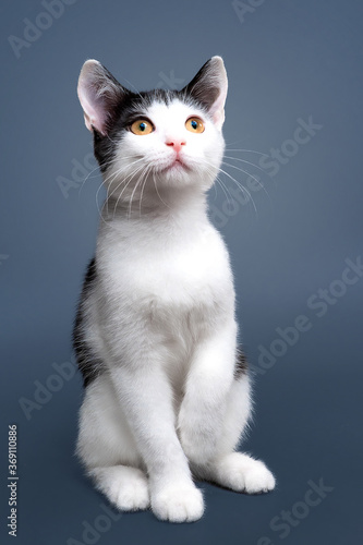 Fototapeta premium Portrait of cute bicolor short hair kitten of two months old. Selective soft focus. black and white cat