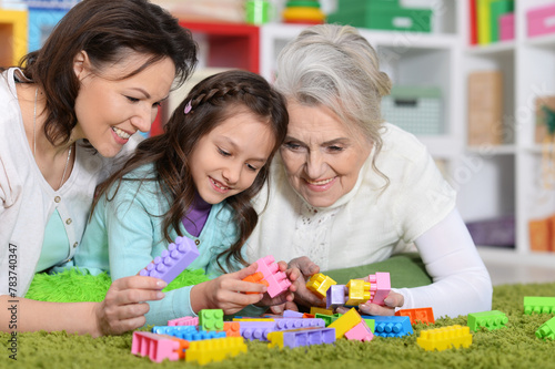 Fototapeta premium Portrait of cute girl playing with mom and grandma in cubes