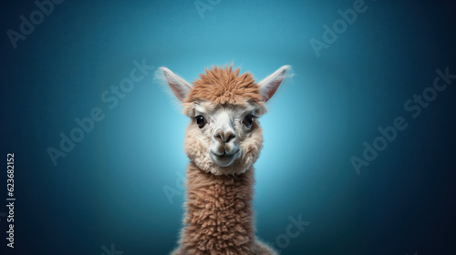 Fototapeta premium Portrait of cute llama on blue background. Funny animal. Generative AI.