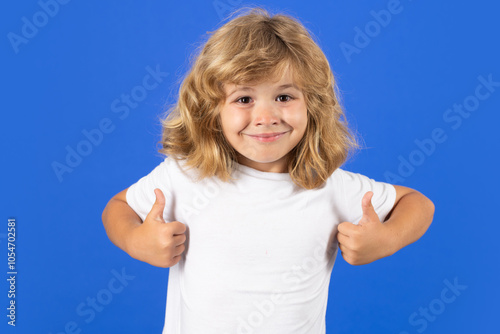 Fototapeta premium Portrait of cute smiling child, isolated studio background. Happy kid, happy and smiling emotions.