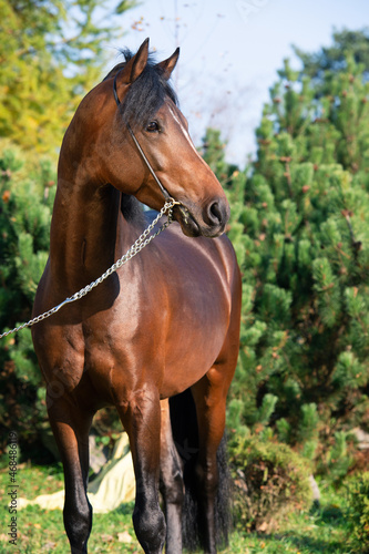 Fototapeta premium portrait of dark bay sportive welsh pony posing in nice stable gearden