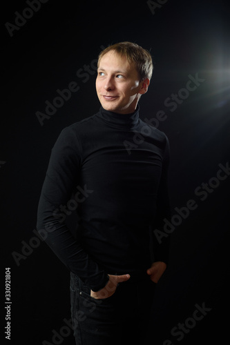 © wolfhound911, Naklejka premium Portrait of determined goodlooking man wearing black shirt, black background.