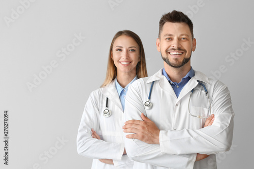 © Pixel-Shot, Fototapeta premium Portrait of doctors on light background
