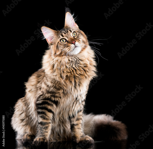 Fototapeta premium Portrait of domestic black tabby Maine Coon kitten. Fluffy kitty on black...