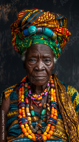Fototapeta premium Portrait of Elderly African Woman in Traditional Colorful Clothing with Elaborate Beaded Jewelry