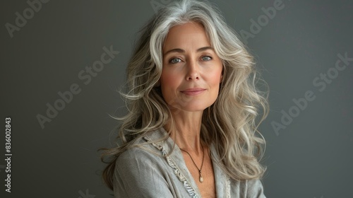 © GENi, Fototapeta premium Portrait of elegant gray-haired european woman practicing skin care routine, perfect for beauty and anti-aging looking camera on gray plain background.