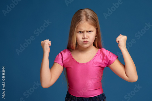 © nazarovsergey, Fototapeta premium Portrait of emotional little girl on blue background