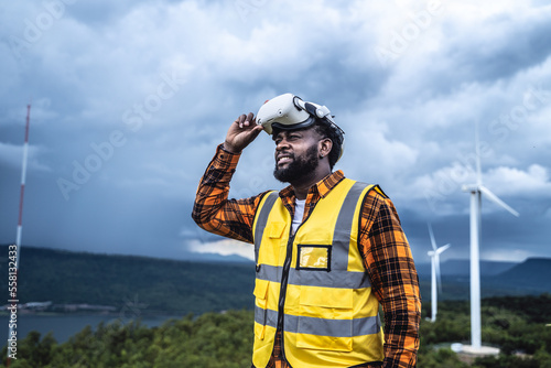 © Jirus, Obraz premium Portrait of engineer African American man working with VR headset in wind turbine farm.