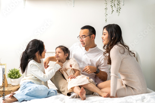 © Art_Photo, Fototapeta premium Portrait of enjoy happy love asian family father and mother holding hug cute little asian girl child smiling play and having fun moments good time in at home