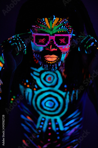 Naklejka premium portrait of fantastic disco dancer with fluorescent make-up glowing in dark...