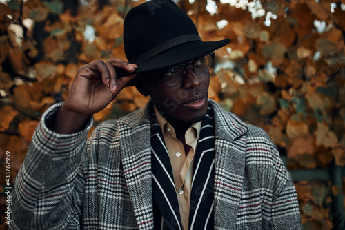 © Anatoliy Karlyuk, Obraz premium Portrait of fashionable handsome young dark skinned gentleman wearing layered elegant outfit posing outdoors, waiting for his date. People, beauty, elegance, style, fashion and trendy clothing