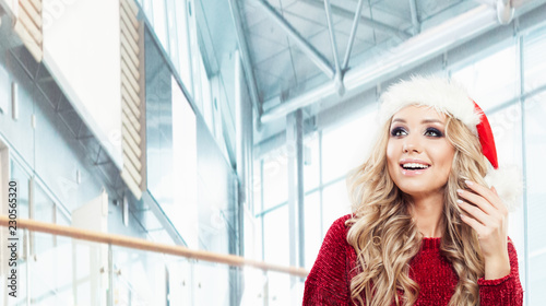 Fototapeta premium Portrait of female model in santa hat. Happy woman, Christmas and New Year...