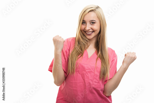 Fototapeta premium Portrait of female nurse wearing scrubs making happy gesture