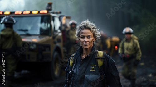 © Ai Inspire, Fototapeta premium Portrait of Firefighter at Wildfire - Generative Ai