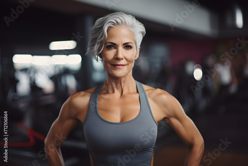 Fototapeta premium Portrait of fit elderly woman with short grey hair with very muscular arms and sport top in gym