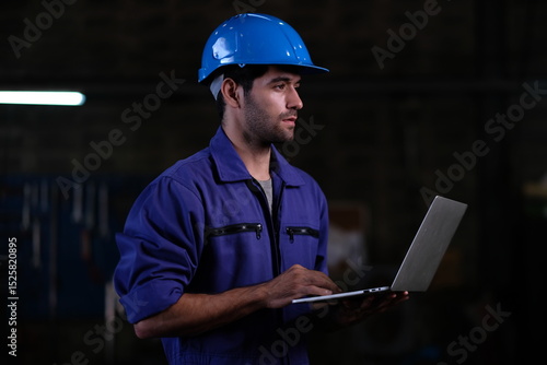© unikyluckk, Fototapeta premium Portrait of foreman, engineer or architect with safety helmet holding laptop and blueprints for inspection details on factory industry material.