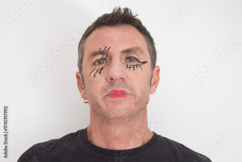 © Pierluigi, Fototapeta premium Portrait of forty-year-old man with eyes and mouth made up for Halloween. The man is forty years old and of Caucasian origin