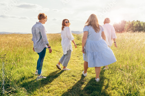 © Soloviova Liudmyla, Naklejka premium Portrait of four cheerful smiling women holding hand in hand walking by a high green grass meadow. They looking at the camera. Woman's friendship, relations, and happiness concept image.