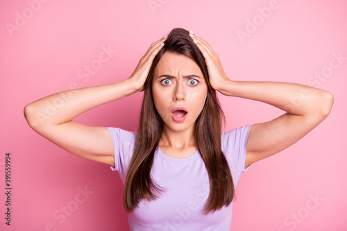 © deagreez, Fototapeta premium Portrait of frightened girl put hands on head open mouth speechless dressed casual violet t-shirt isolated on pink color background