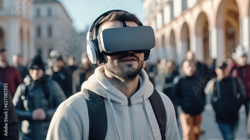 Fototapeta premium Portrait of gamer man wearing VR glasses outdoors.