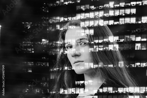 © svetlanais, Obraz premium Portrait of girl on the background of office windows . Concept of business, new opportunities, partnership. Double exposure