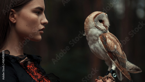 © Stanislav, Naklejka premium Portrait of girl with owl in hand. Close-up.