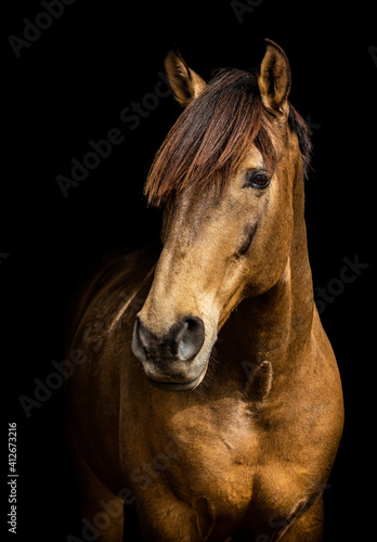 © Ayla Harbich, Fototapeta premium Portrait of golden Lusitano horse, on black background.
