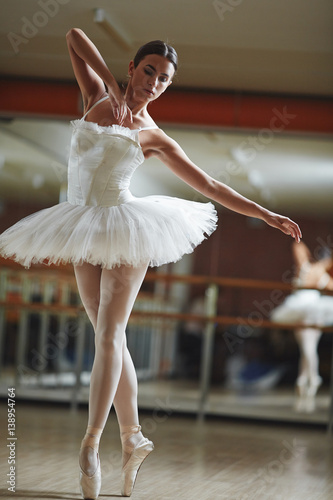 Fototapeta premium Portrait of graceful ballerina wearing white tutu dancing in half-lit ballet studio practicing for stage performance