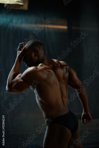 Obraz premium Portrait of handsome african american male body builder with naked torso...
