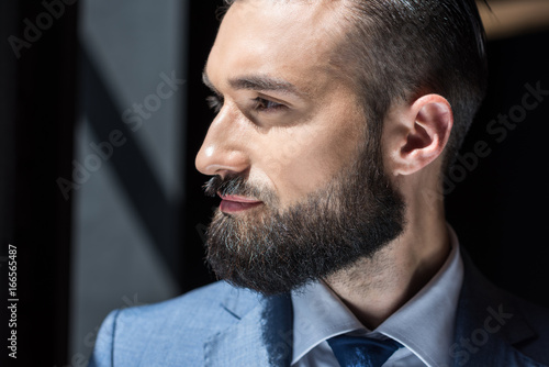 Fototapeta premium portrait of handsome bearded businessman in grey suit looking away